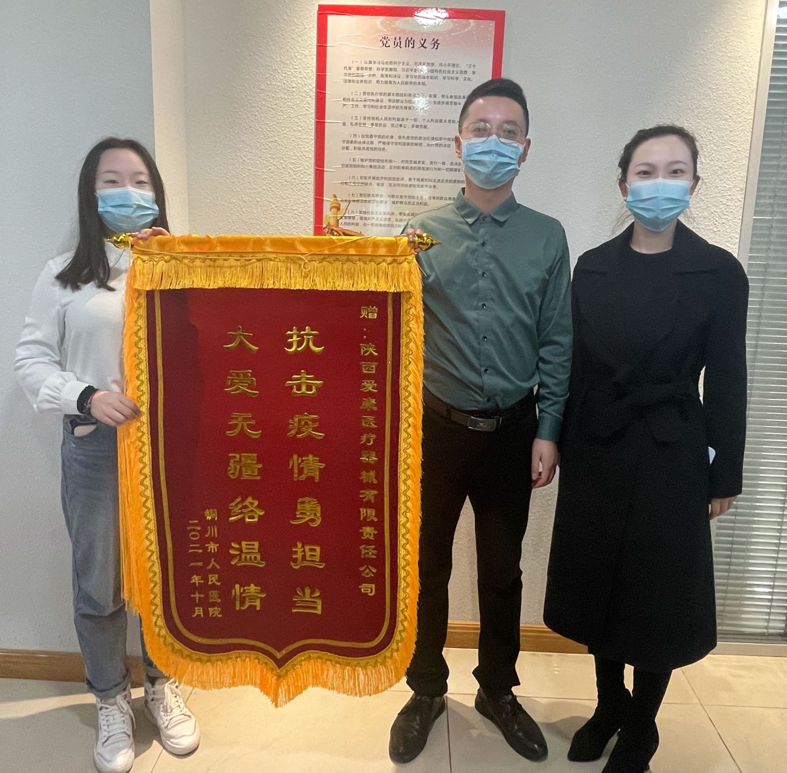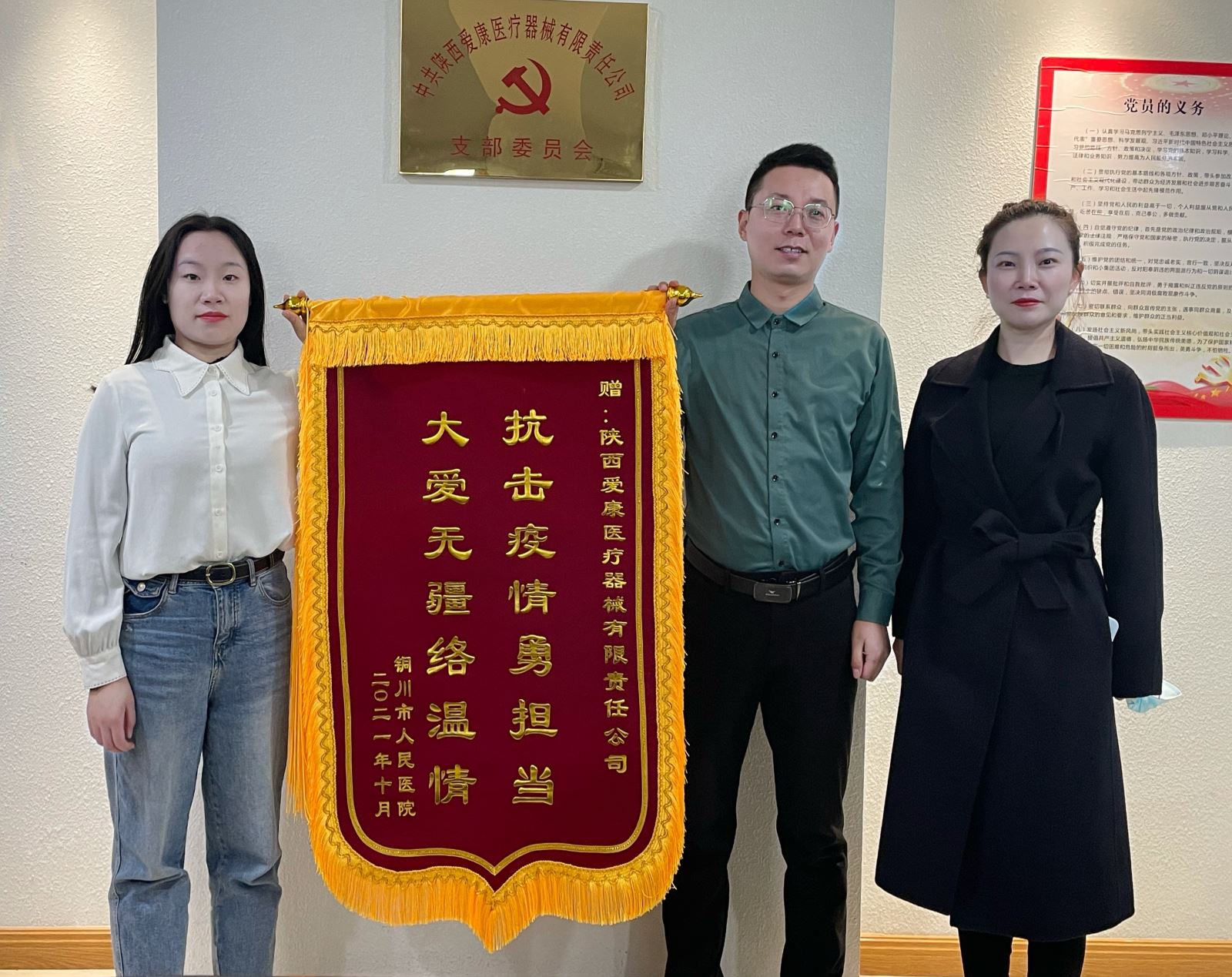 2021年10月,愛康集團(tuán)銷售副總夏蓓蓓在銅川市人民醫(yī)院進(jìn)行業(yè)務(wù)溝通時,醫(yī)院方將一面寫有“抗擊疫情勇?lián)?dāng),大愛無疆絡(luò)溫情”的錦旗送至夏副總的手中,感謝我司在整個抗擊疫情的過程中對醫(yī)院的全力支持。